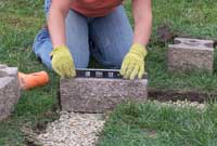 Level the base trench. Make any adjustments as needed by adding or removing base rock.