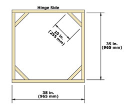 Begin your compost lid by constructing 2 lid frames using the layouts below. Use 2 in. x 3 in. (50 mm x 75 mm) wood studs to construct. One side of each lid frame is designated to be the hinge side. This piece of wood will need to be cut at an angle so the hinges will move properly once assembled (see Figure 1).