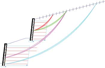 LEM uses a Bishop’s Simplified Method of Slices global modeling method to determine the forward forces that need to be resisted by the geogrid layers and facing material. It is not meant to replace the need for a complete global stability analysis, but rather provides a more refined evaluation of the internal forces in the reinforced mass. For a LE Bishop’s Model to be as accurate as possible, a model must create a complete envelope of coverage, analyzing slip arcs from the extreme outer nodes to the very close nodes directly behind the face and virtually every point in between.